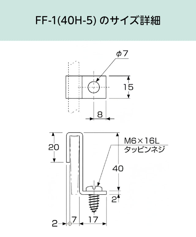 「FF-1(40H-5)」は、正方形マス 40ミリ角(OG4040)(40ミリ厚)・正方形マス 83ミリ角(OG8040)(40ミリ厚)のFRPグレーチング専用の取付金具です。グレーチングに引っ掛けて、ネジで床や天井、壁に固定することができます。