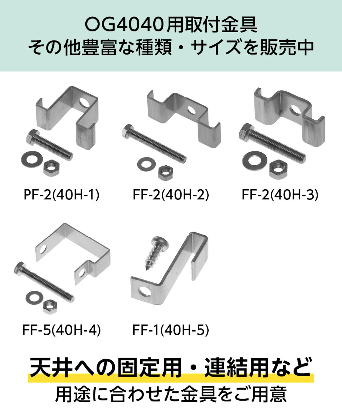 当社では「FF-1(40H-5)」以外にも豊富な取付金具をご用意しています。場所や用途に合わせた金具をご提案しますので、金具選びに不安がある方はお気軽にご相談ください。
