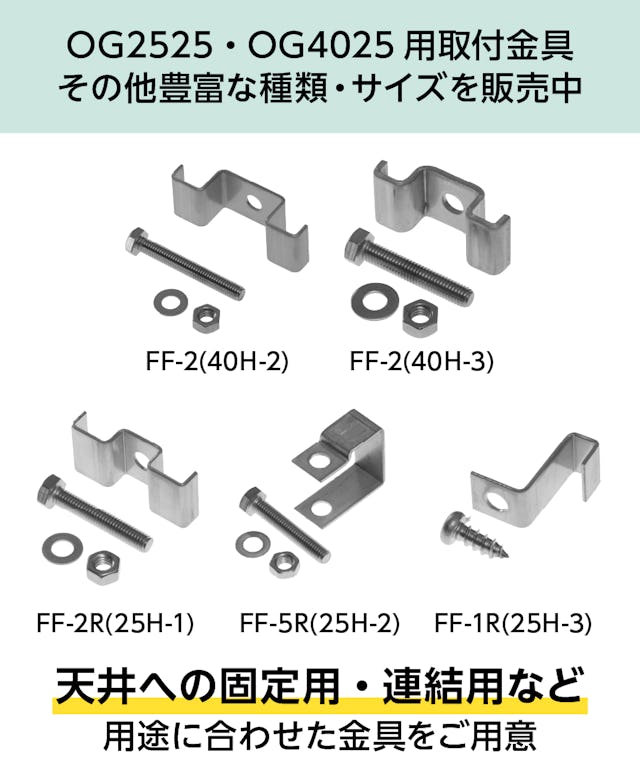 当社では「FF-1R(25H-3)」以外にも豊富な取付金具をご用意しています。場所や用途に合わせた金具をご提案しますので、金具選びに不安がある方はお気軽にご相談ください。