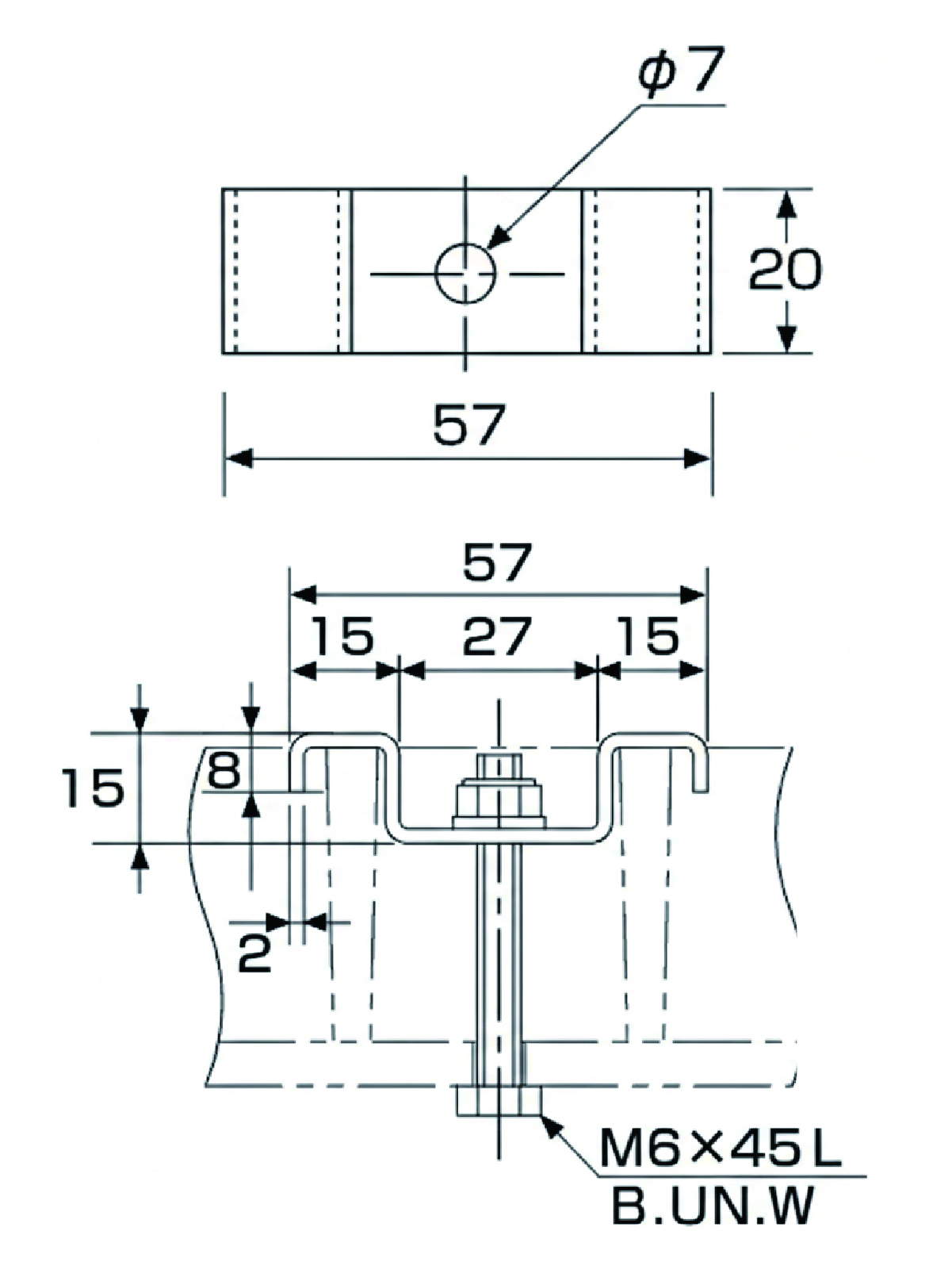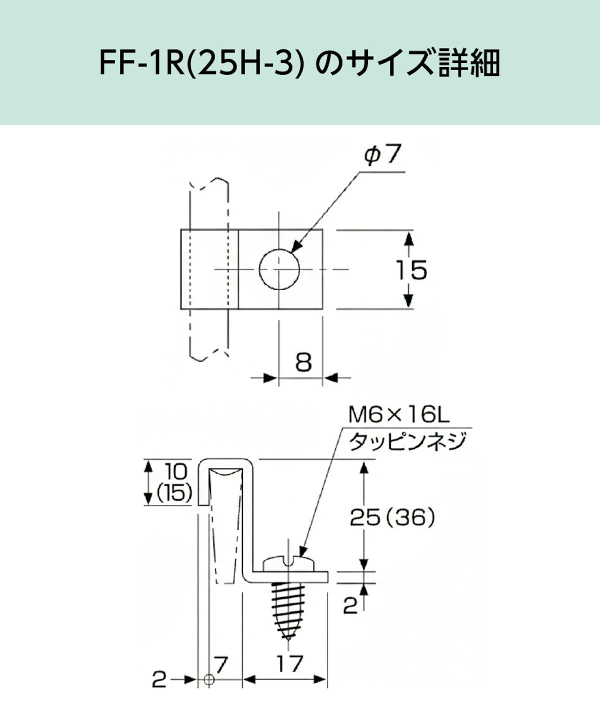 「FF-1R(25H-3)」は、OG2525(マス目25ミリ×100ミリ・25ミリ厚)・OG4025(マス目40ミリ角・25ミリ厚)のFRPグレーチング専用の取付金具です。グレーチングを引っ掛けて、ボルトで床や天井、壁に固定することができます。